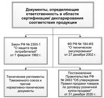 Нарушение законодательства в части отсутствия обязательных разрешительных документов на продукцию влечет за собой административную ответственность. Это установлено в статьях 4 и 7 закона Российской Федерации № 2300-1 «О защите прав потребителей» от 7 февраля 1992 г. Без сертификата или декларации о соответствии товаров, безопасность которых должна быть подтверждена в процессе обязательной сертификации или декларирования, невозможен законный выпуск в обращение такой продукции.Обязательное наличие разрешительных документов на товары, предназначенные для продажи на территории нашей страны, также регламентируется федеральным законом № 184-ФЗ «О техническом регулировании» от 27 декабря 2002 г. (далее ФЗ № 184), в котором собраны общие обязательные требования к проектированию, производству, а также реализации различных групп продукции. В законе установлены возможные формы подтверждения соответствия, в частности обязательная сертификация или декларирование, и документы, определяющие эти требования.